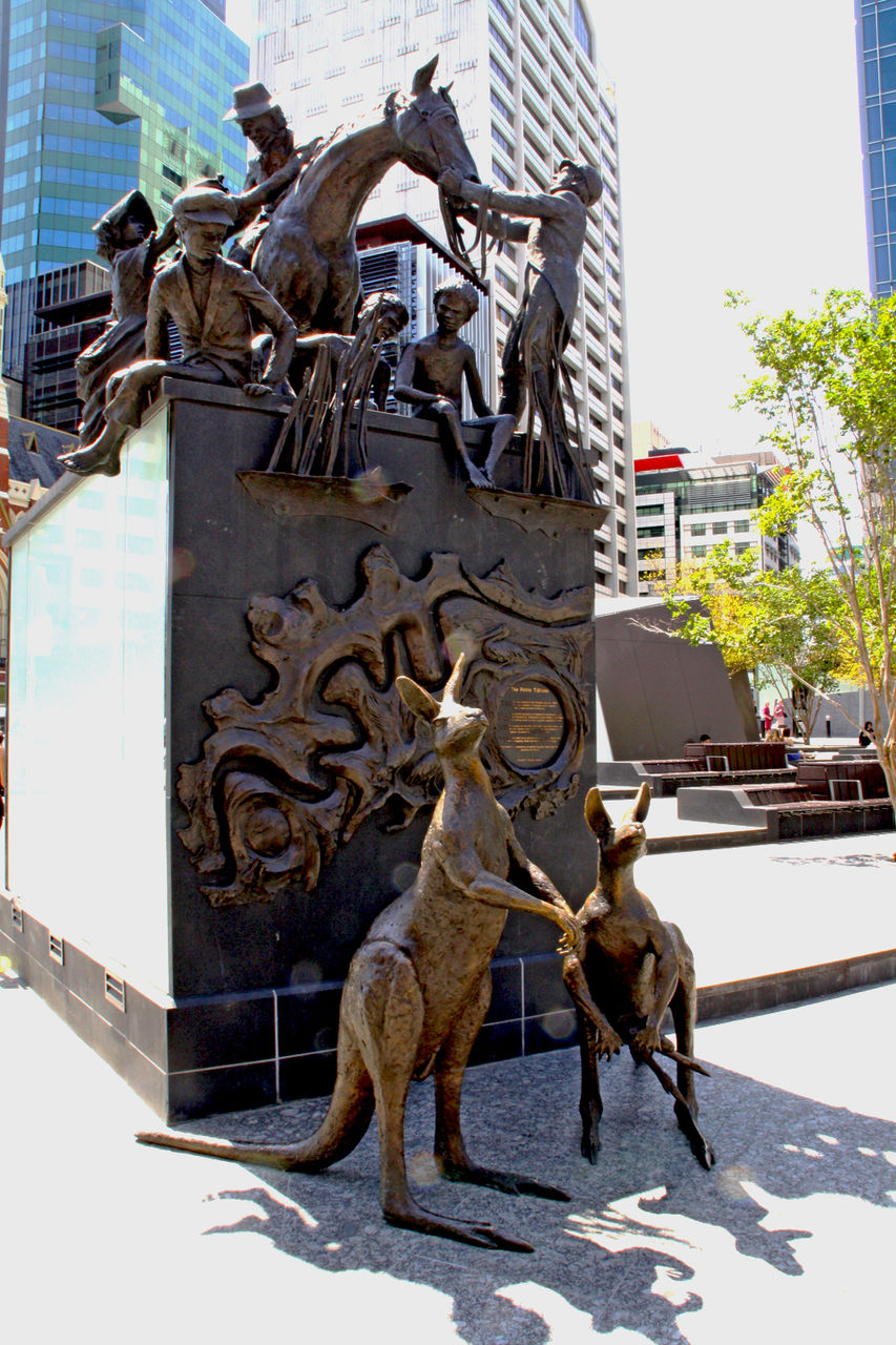 Description of artwork: According to Judith McKay's Brisbane Sculpture Guide: A Walk Around Public Sculpture in the City,"The Doric columns and entablature over the money-changer refer to the stability and antiquity of banking".