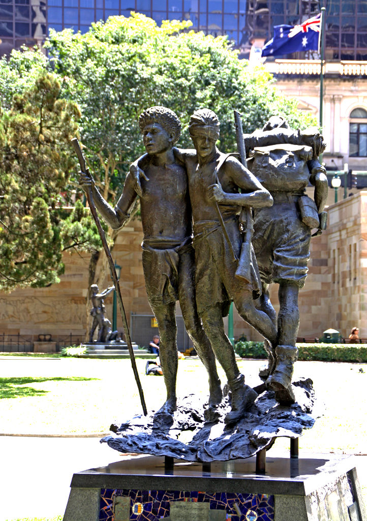 Description of artwork: The memorial is a tribute from Brisbane City Council to those soldiers who fought at Milne Bay and in the Kokoda Campaigns and was unveiled during the 50th anniversary year.