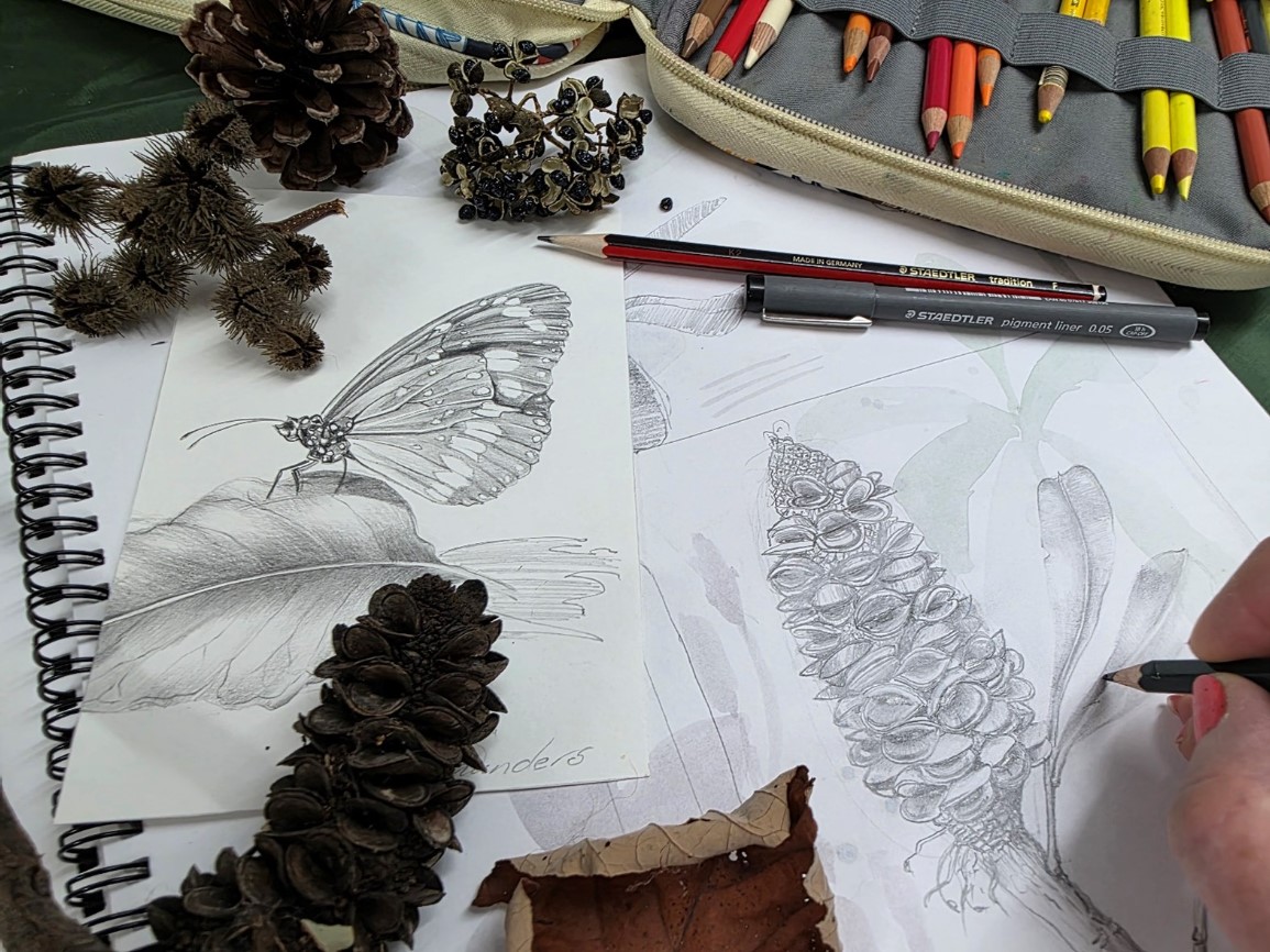 Join Louise (botanical artist) for a lesson in drawing on nature, discovering the intricacies of drawing what you see - like a seed pod, leaf, seashell or a butterfly. Learn how to add tone and hints of colour to your drawing using simple art materials. Louise has a relaxed teaching style and will demonstrate some easy drawing techniques for you to try. We will be working with graphite and coloured pencils on drawing paper, all of which will be supplied. You can also bring your own pencils if you wish. A selection of natural materials will be available for inspiration on the day.