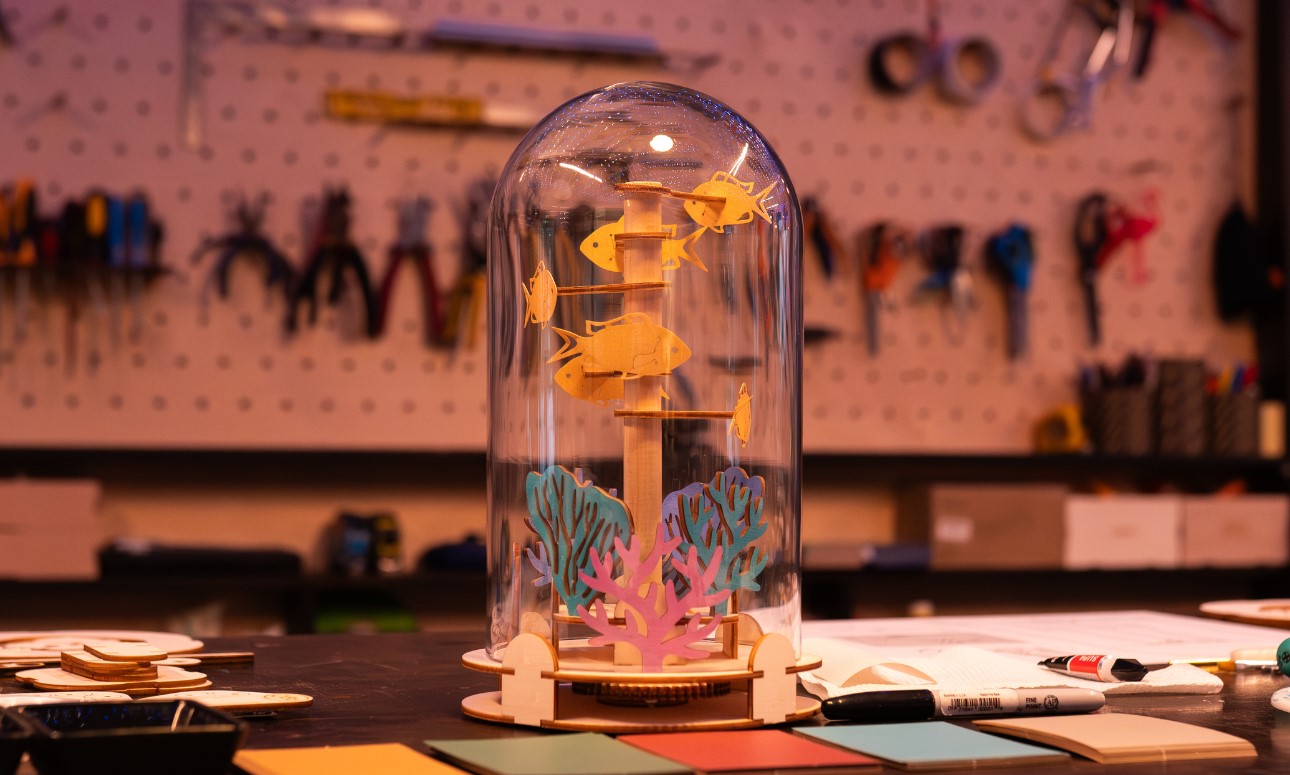 Corral around the benches and embrace the allure of Australian seascapes, as you join us to create a unique mechanical reef. Customise and design your seascape and fish, paint your seascape with inks colour matched to species native to the Great Barrier Reef, and observe the material of your fish being cut out on the laser cutter. You will then assemble your coral reef landscape inside a glass dome and construct the mechanism to make it move. We hope to sea you there!