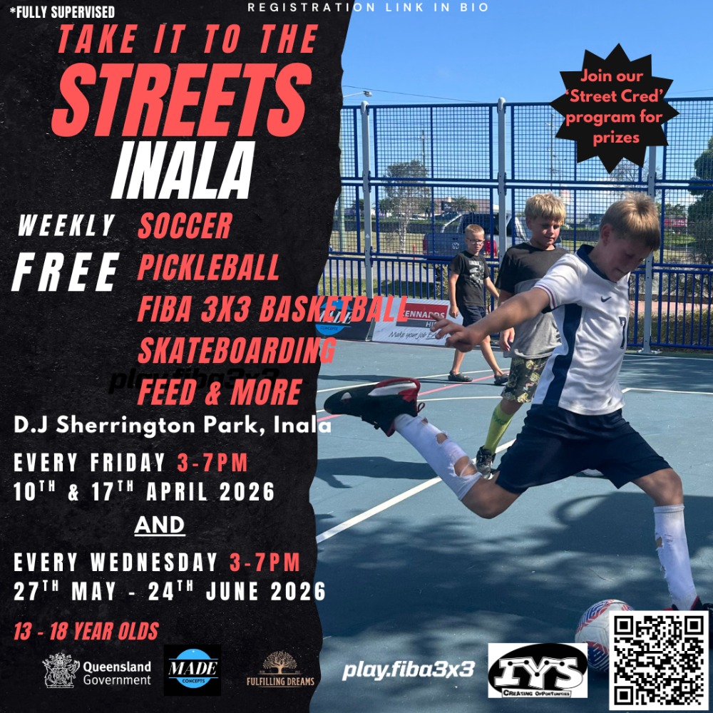 Take it to the Streets - Inala Join us for an afternoon of fun games, activities, music and free food @ D.J Sherrington Park, Inala. 13 - 18 year olds welcome! Run by professional players and coaches, this program will feature: Soccer, FIBA 3x3 Basketball, Pickle Ball, skateboarding, free food & free entry! Prize giveaways every week! Bring water bottle, towel and basketball.