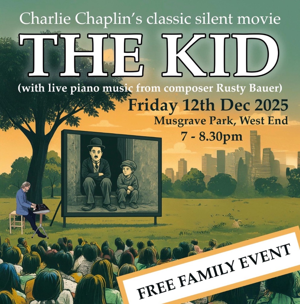 Brisbane’s own Rusty Bauer — better known to many as the Trombone Dad in the viral “Oven Kid” videos — is bringing a touch of old-school movie magic to Musgrave Park on Friday, 12 December. Settle in under the stars for a free, family-friendly screening of Charlie Chaplin’s beloved silent classic The Kid from 1921. The fun kicks off at 7pm, with the film running for around 75 minutes — and in true 1920s style, Rusty will perform a live, original piano soundtrack in perfect sync with the action on screen. Pack a picnic, grab a blanket, and enjoy a nostalgic night at the movies!